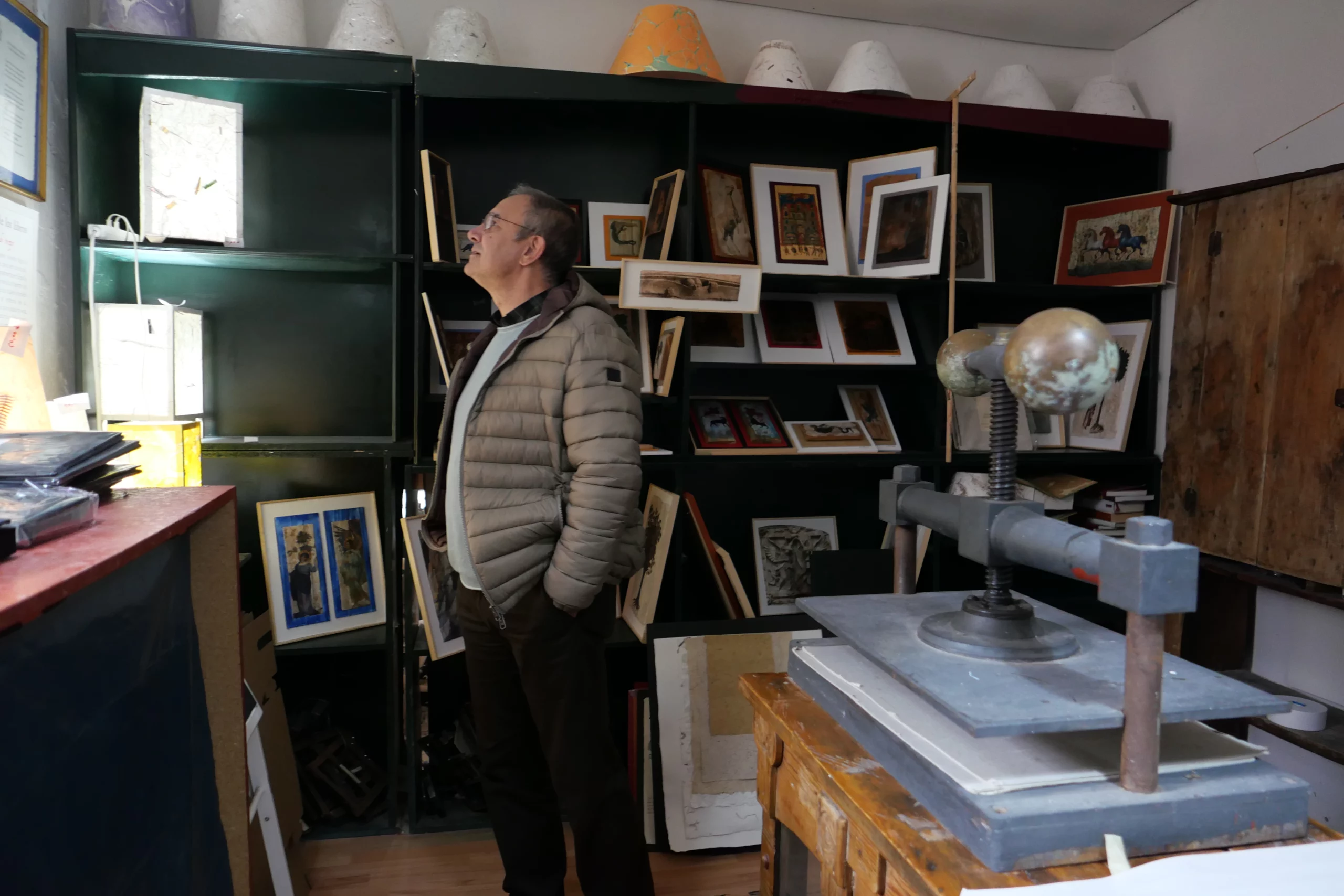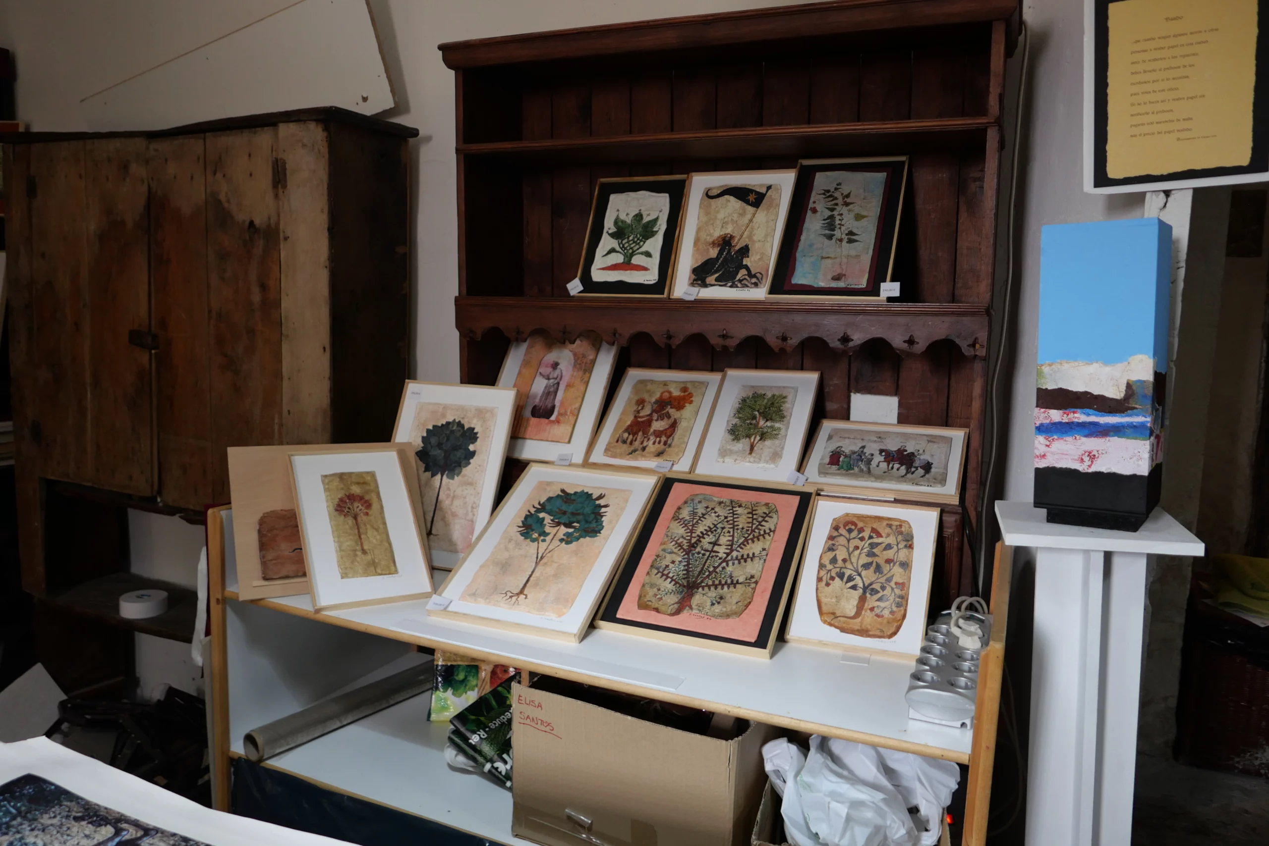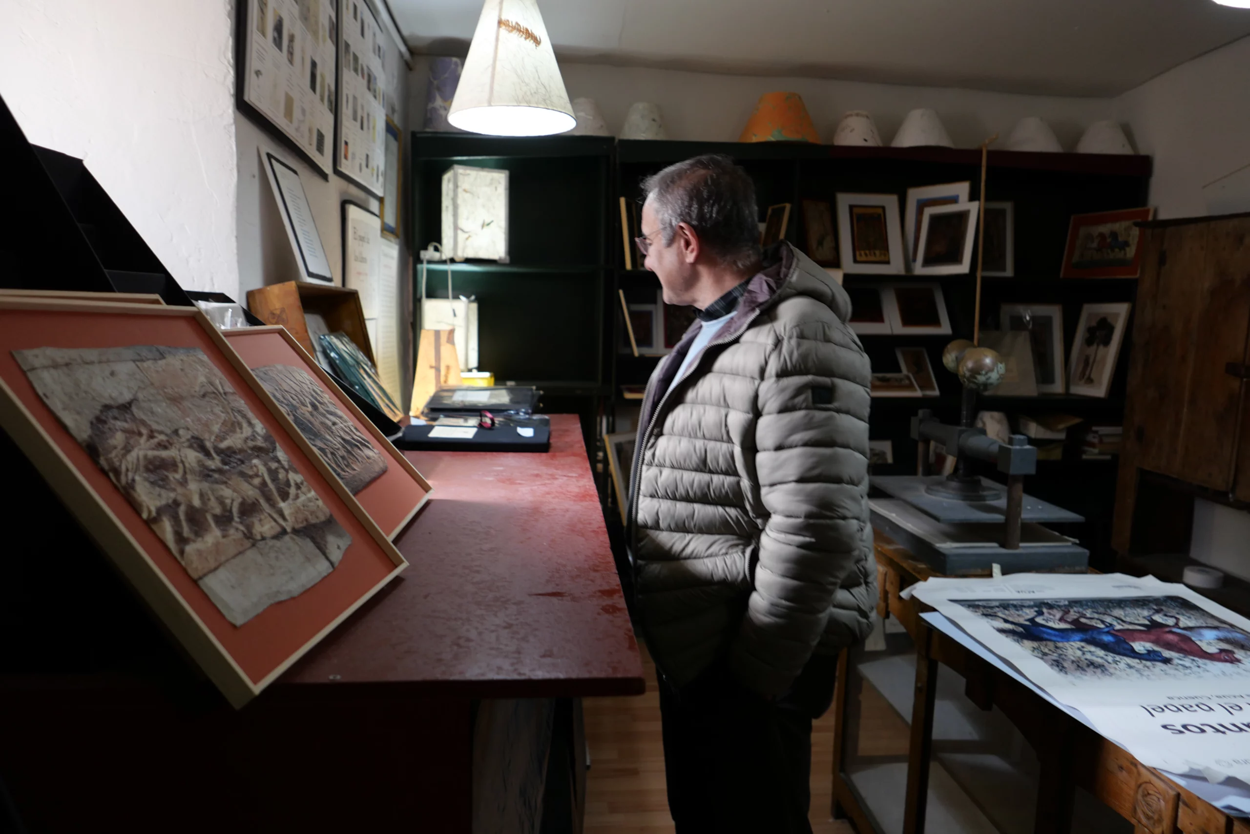 El taller se abre en varios rincones que parecen crecer unos dentro de otros, sin que sobre espacio en ninguno. En la estancia más amplia reposan varias mesas de trabajo, cargadas de tiempo, de paciencia y de memoria. Sobre una de ellas conviven un ordenador y una impresora de tinta indeleble; desde allí nacen las imágenes que imprime en delicado papel de seda para después transferir sus colores al papel que él mismo fabrica, como si cada obra fuera un pequeño milagro artesanal. El resto de mesas están ocupadas con pruebas, obras ya acabadas, libros de artista, y los utensilios y herramientas necesarias.