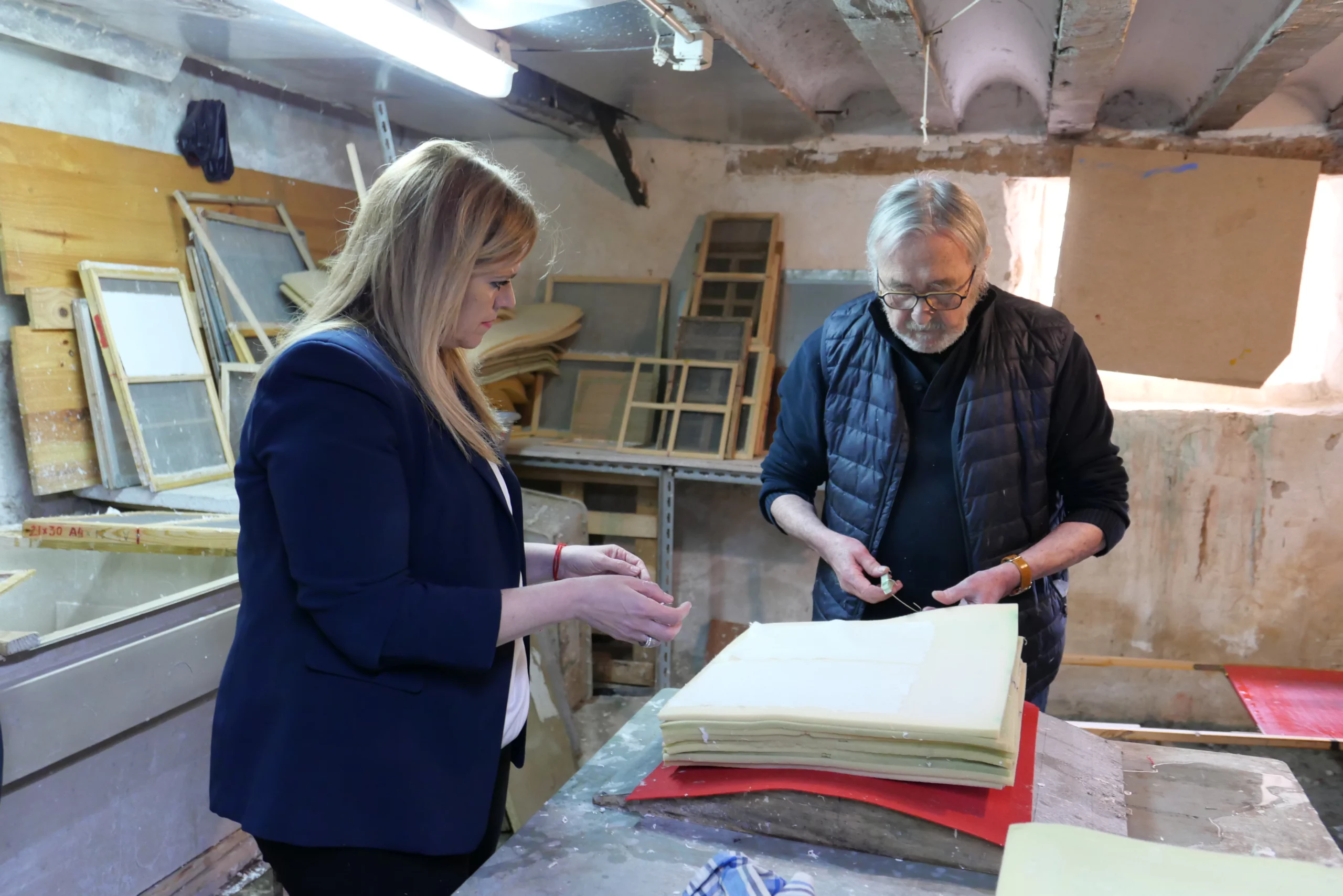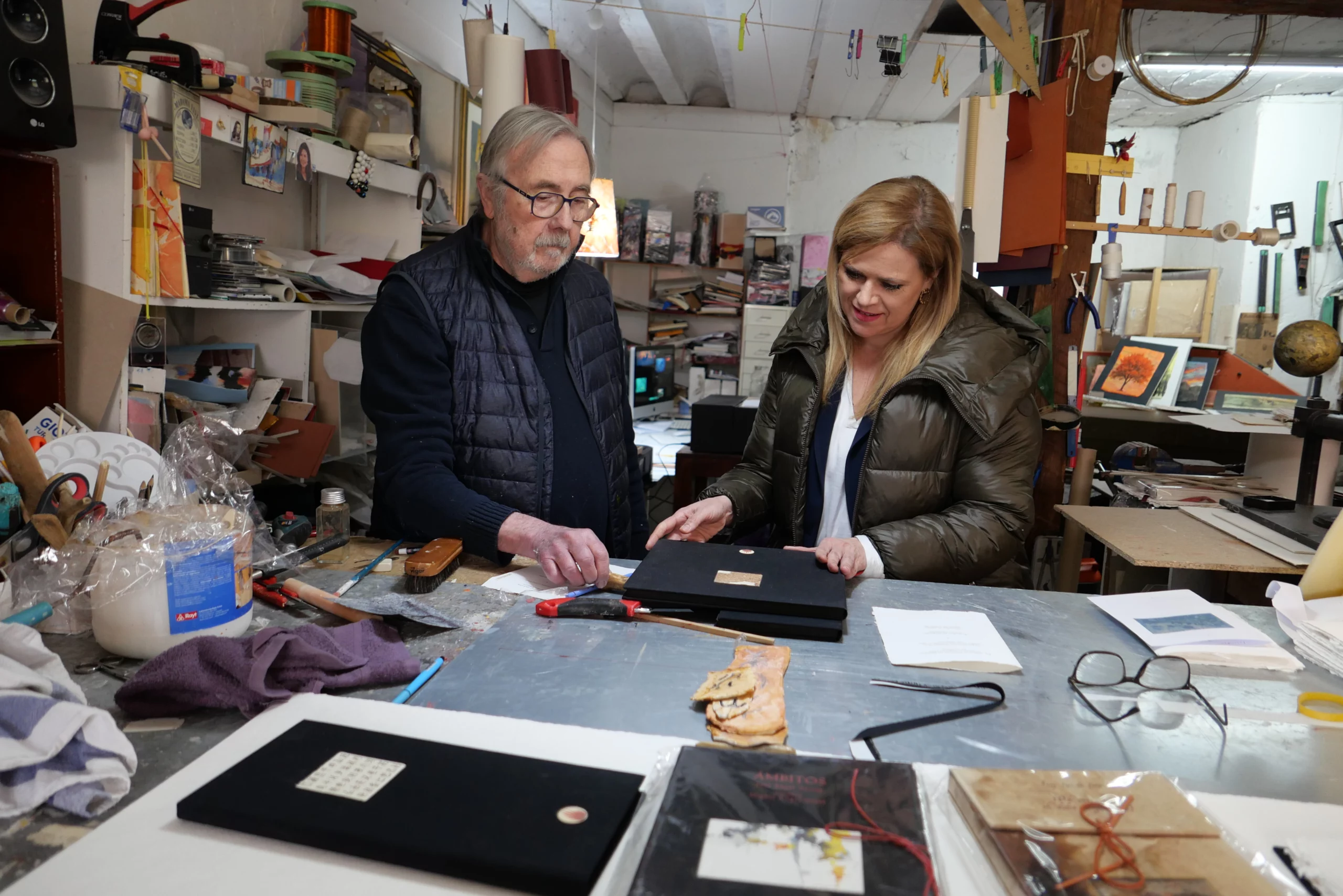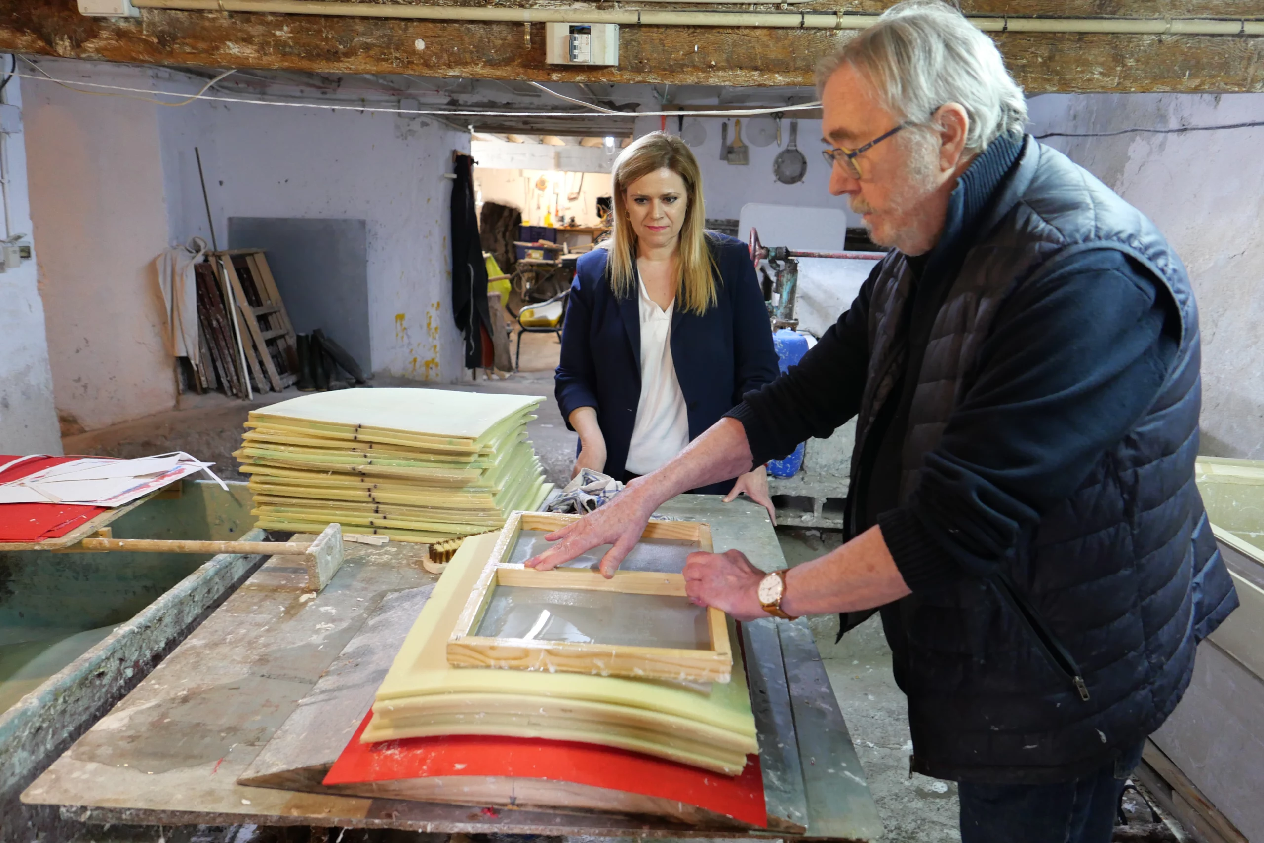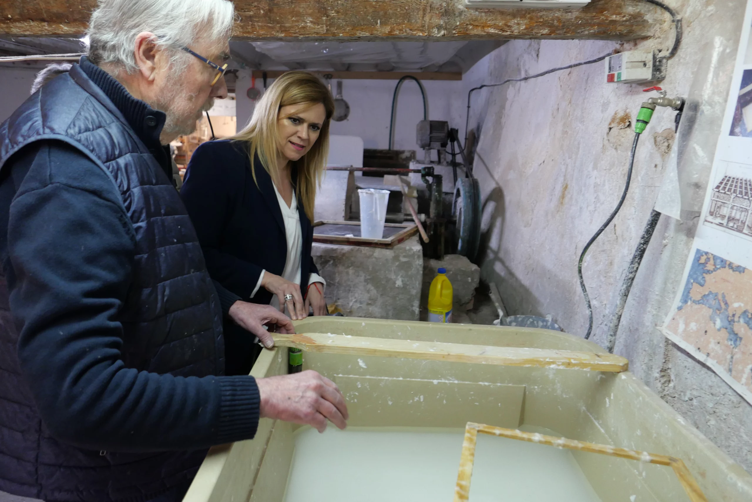 El primer taller que han visitado la diputada provincial de Cultura, María Ángeles Martínez y el director de la FAP, Jesús Carrascosa, ha sido el de Segundo Santos (Las Pedroñeras, 1951), un artesano que lleva más de 46 años elaborando papel a mano en Cuenca.