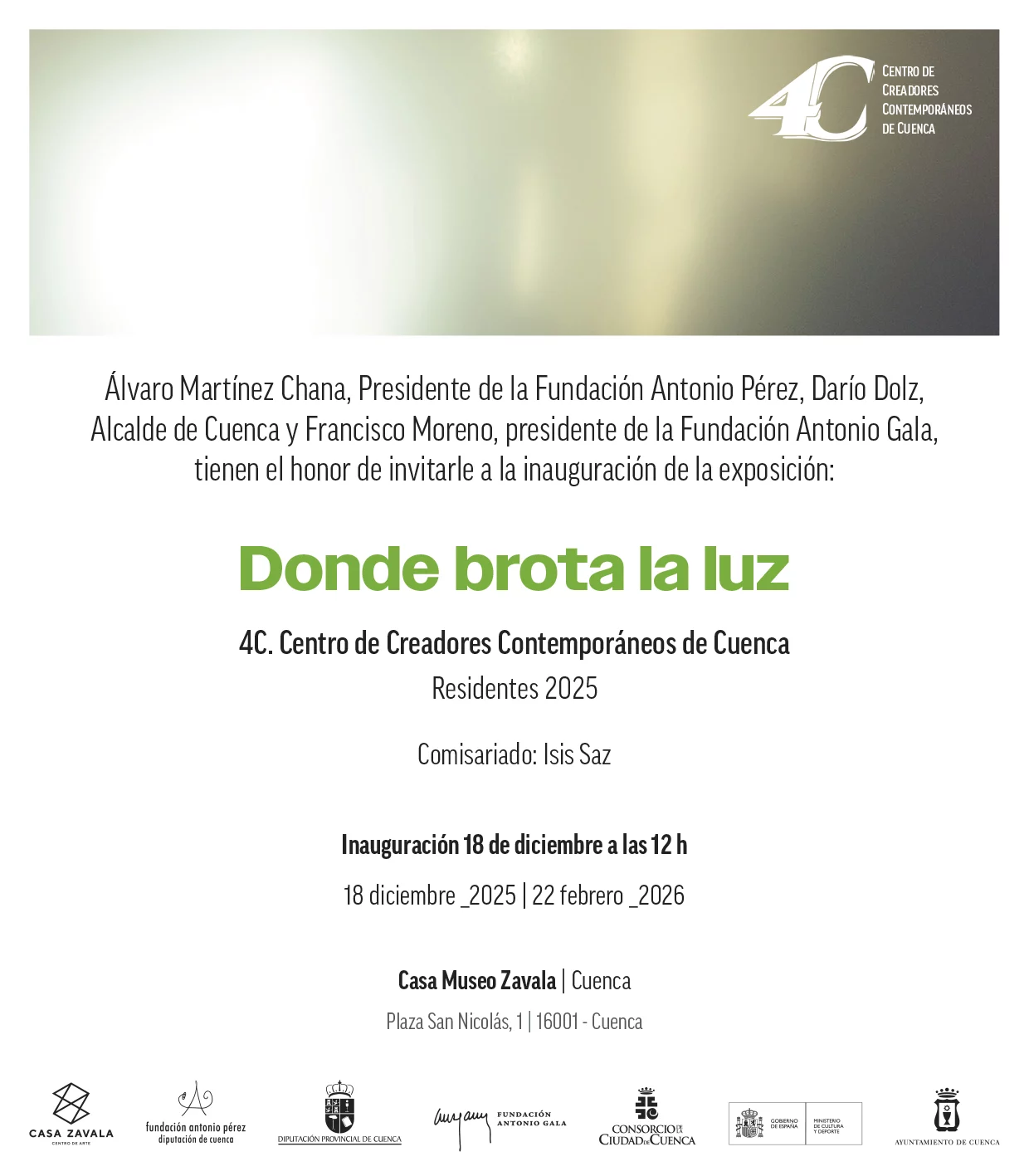 El Museo Casa Zavala presenta, el jueves 18 de diciembre la exposición, Donde Brota la luz, exposición de la primera promoción de Residentes del Centro de Creadores Contemporáneos de Cuenca, 4C, Fundación Antonio Gala, en colaboración con la Fundación Antonio Pérez y comisariada por Isis Saz.