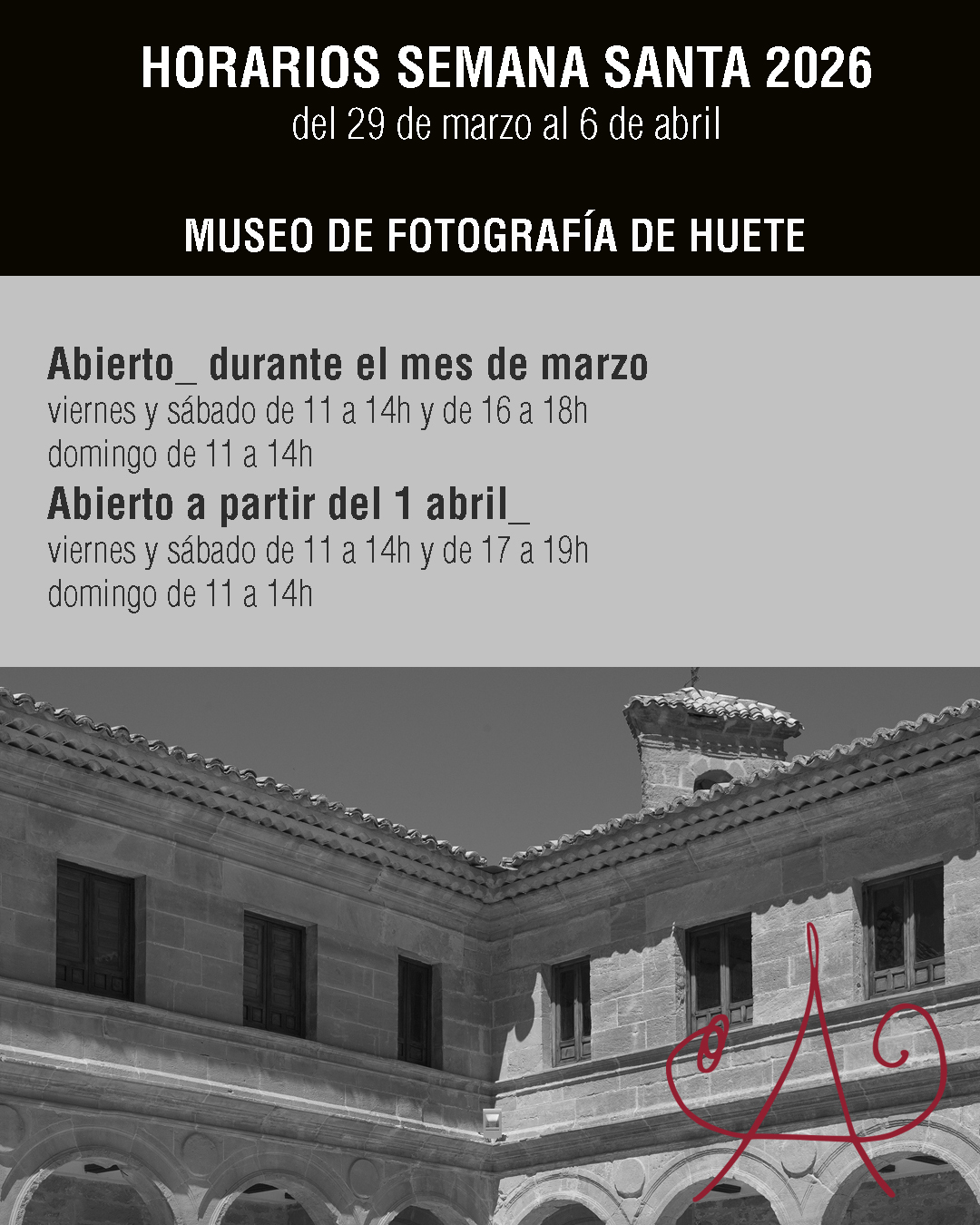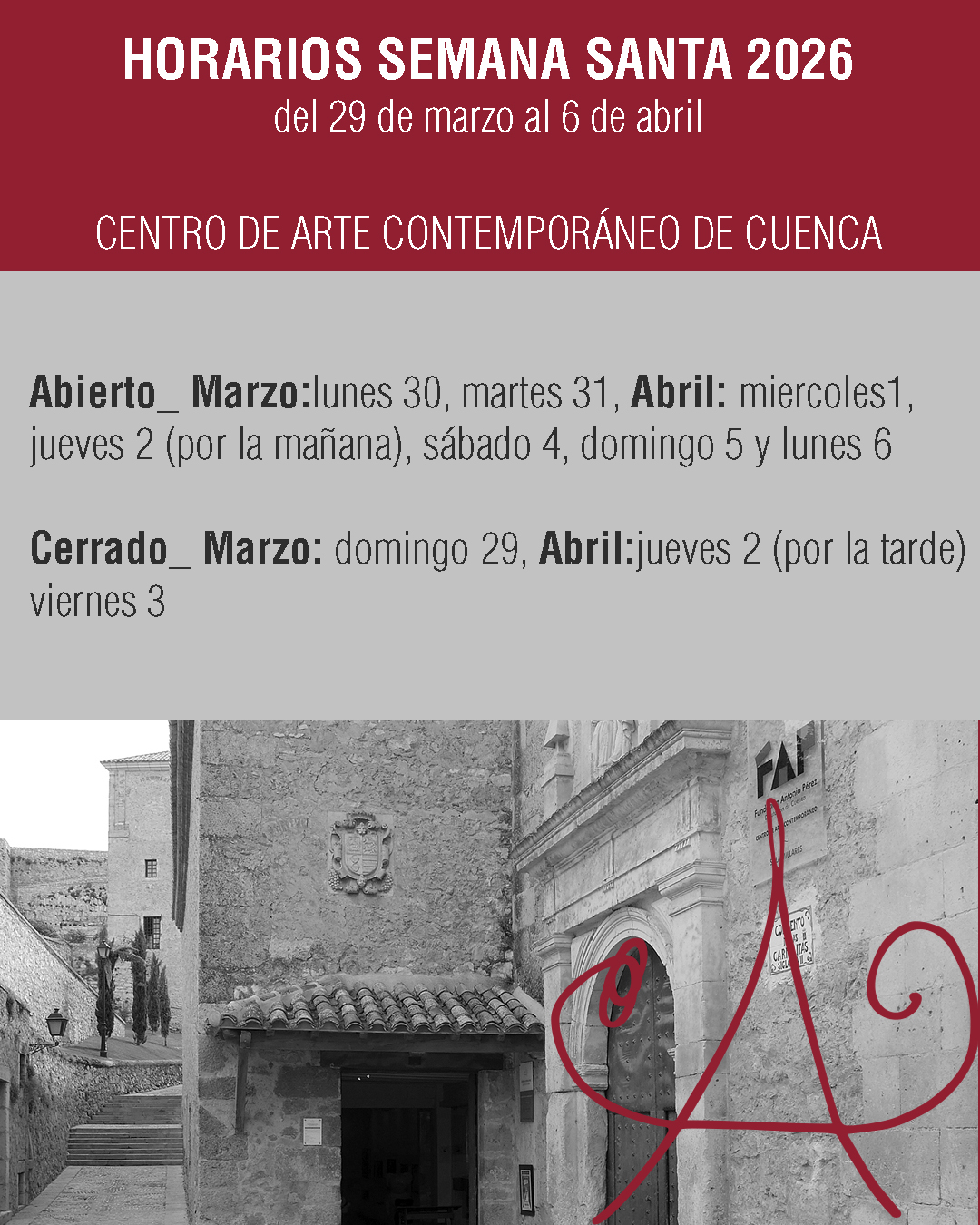El Centro de Arte Contemporáneo de Cuenca, sede de la FAP en la capital, presenta cambios en el horario habitual con aperturas especiales los lunes 30 de marzo, 6 y 13 de abril y con cierres el domingo de ramos, el jueves ( por la tarde) y el viernes santo.