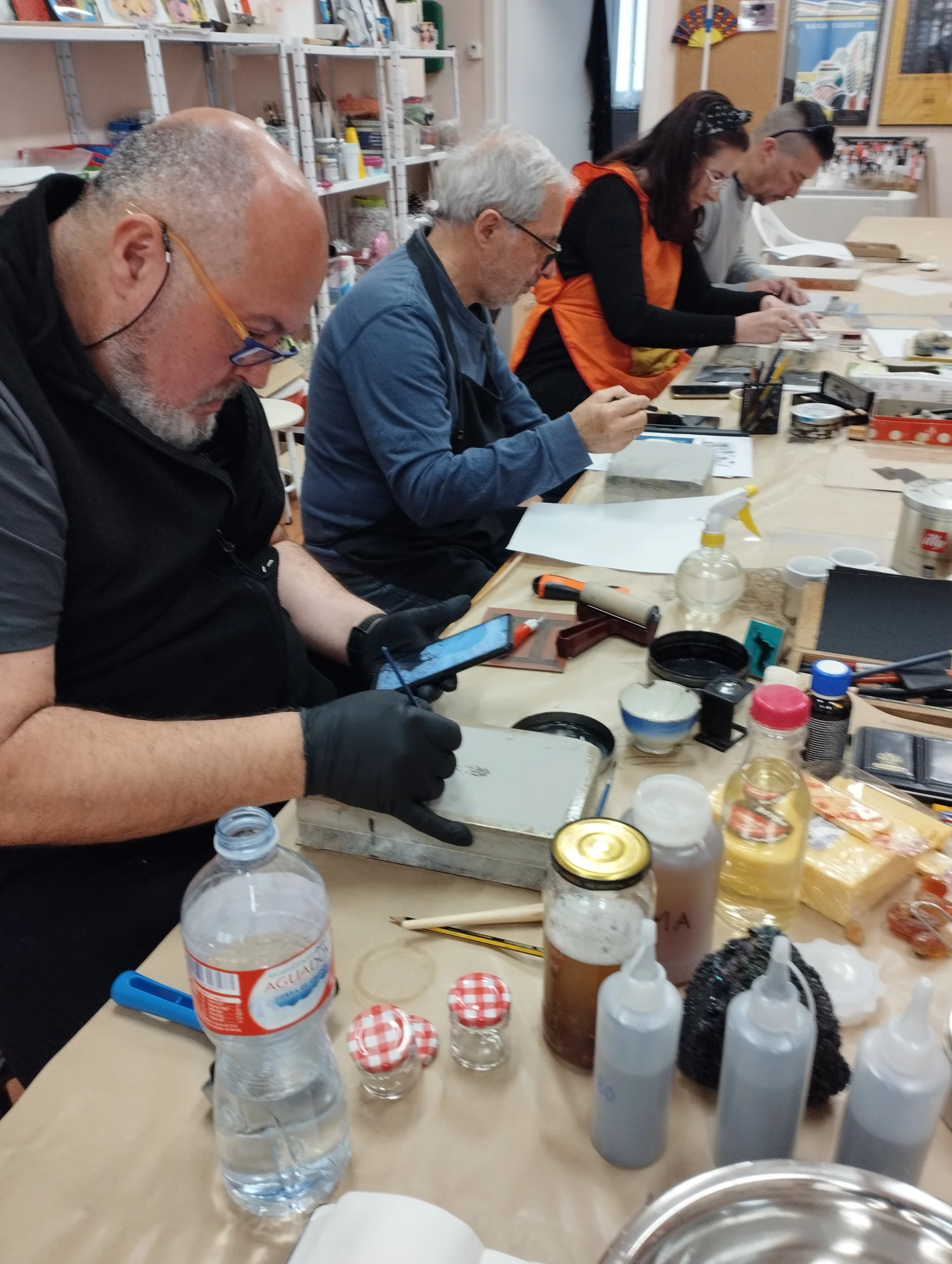 Una vez terminados los dibujos, procedemos a comprender el procesado químico que estabilizará la imagen sobre la piedra. Éste es diferente según el material de dibujo utilizado, por lo que prestamos gran atención a cada dibujo y trabajamos conjuntamente todos los proyectos para ampliar conocimientos.