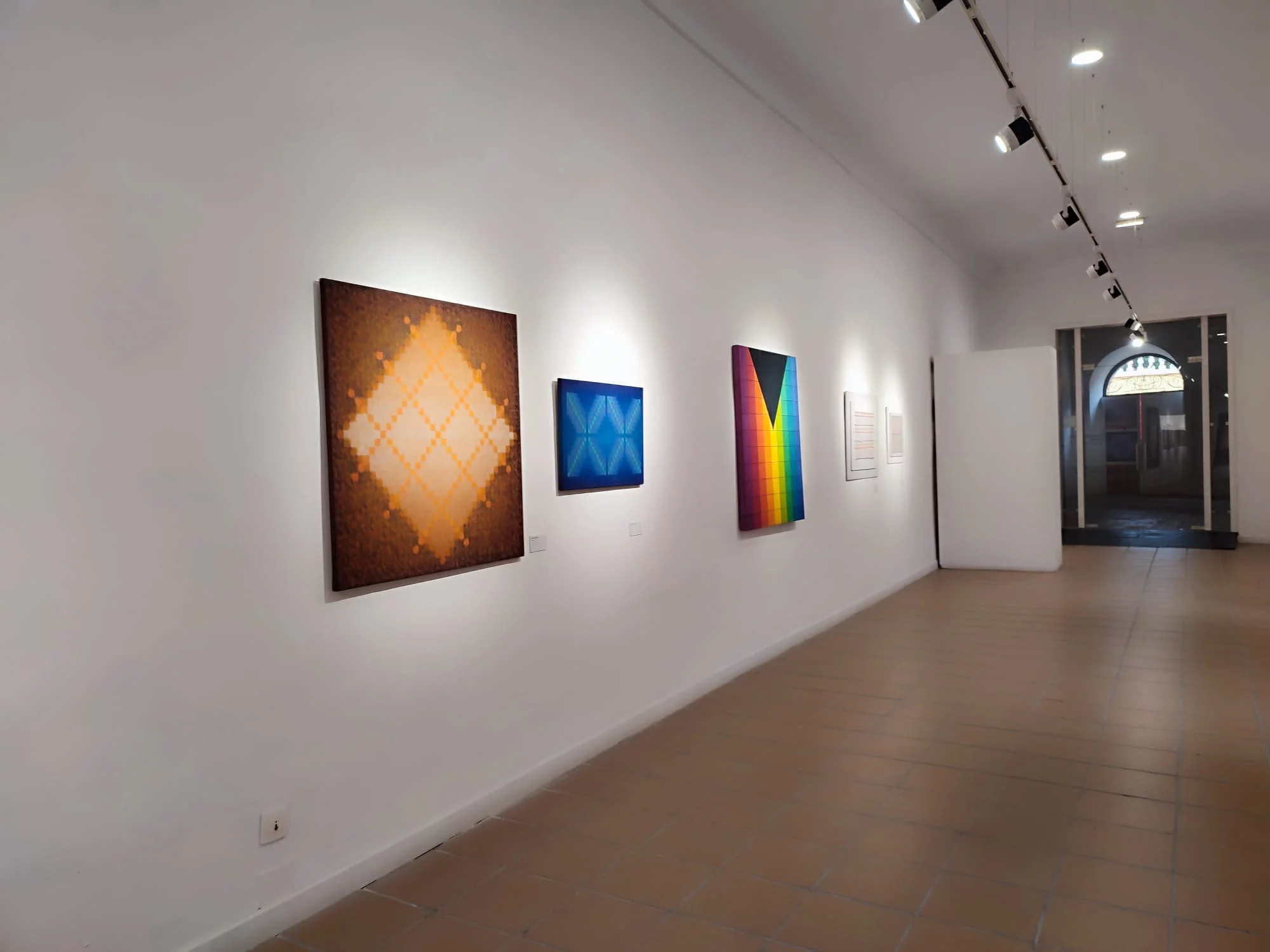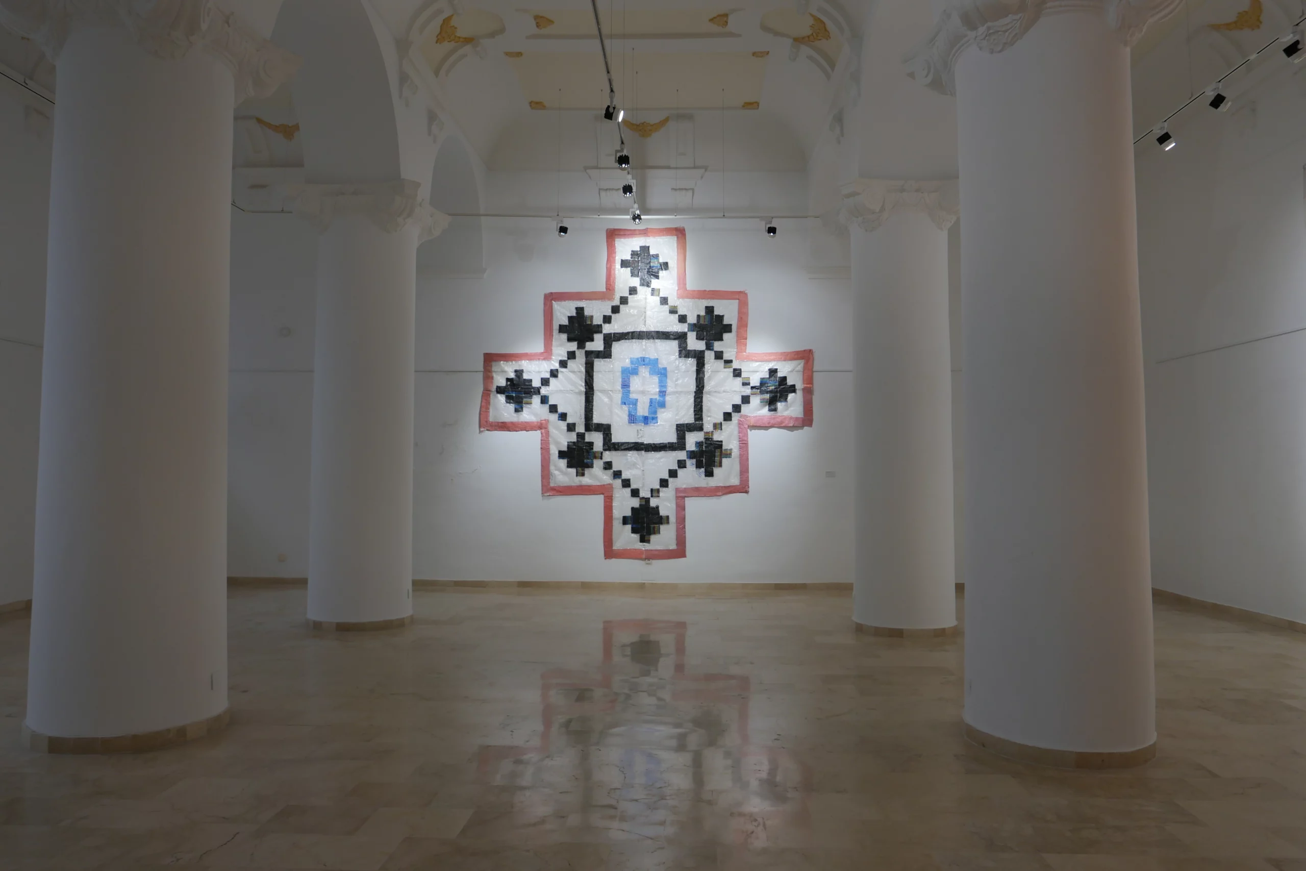 Chakanas de Candelaria Traverso (Córdoba, Argentina, 1991), muestra siete piezas o tapices inspirados en textiles andinos, recuperando sus geometrizaciones y escalonamientos, y conectando simbólicamente el pasado ancestral con el presente global.