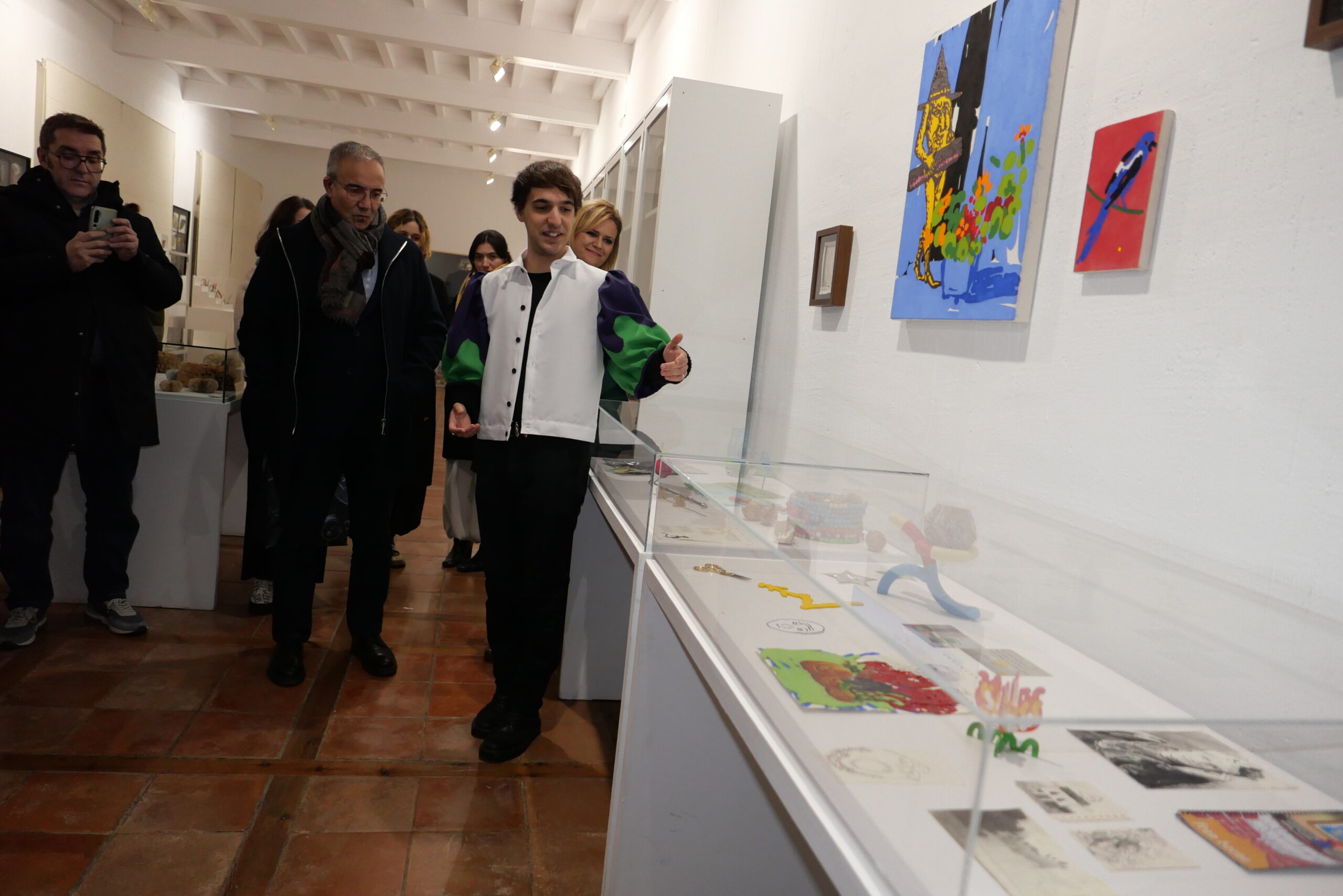 Junto a estos trabajos, encontramos otros objetos de referencia para él como unas tijeras con forma de grullas, un apagavelas con una nariz de payaso, bocetos de algunas de sus obras como las bailarinas de escayola, caras y máscaras, dibujos imitando al grabado, pinturas imitando un dibujo digital, un fanzine rompecabezas, una flor que hace referencia al libro “Los niños tontos” de Ana María Matute o una figura que representa el mito de Sísifo y carga no con una gran piedra sino con un poliedro.